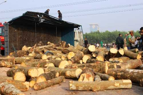 | Xe tải lật nhào, hơn chục khối gỗ tràn xuống đường gây tắc nghẽn giao thông |