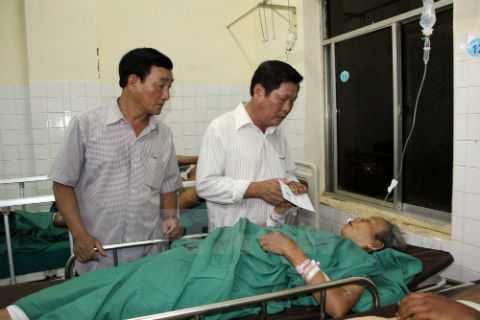 | Ông Nguyễn Bốn (thứ hai từ phải sang), Chủ tịch Ủy ban Nhân dân tỉnh Đắk Nông, Trưởng Ban An toàn giao thông tỉnh thăm hỏi, động viên các nạn nhân. (Ảnh: Anh Dũng/TTXVN) |