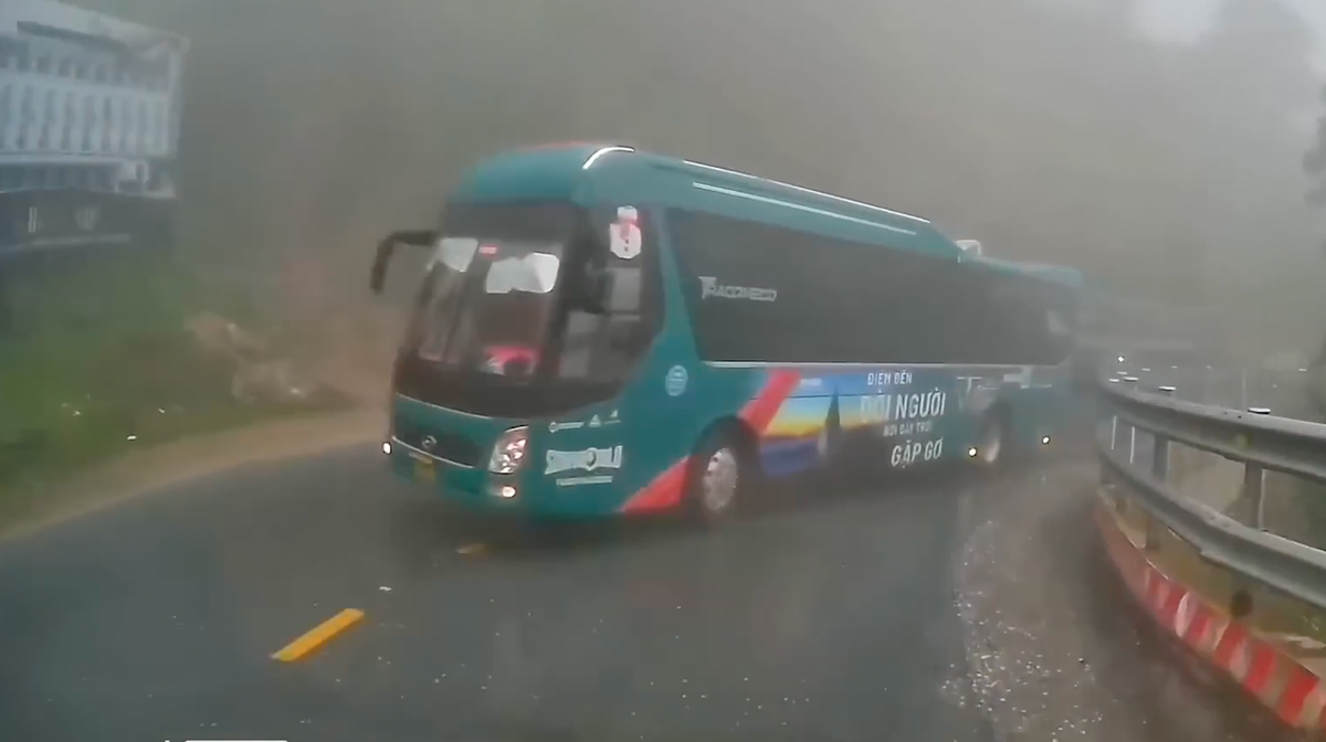 Tình huống va chạm nguy hiểm giữa xe khách và xe tải được camera hành trình ghi lại ngày 24/8 tại đường đèo hướng lên Thị trấn Sapa, tỉnh Lào Cai.