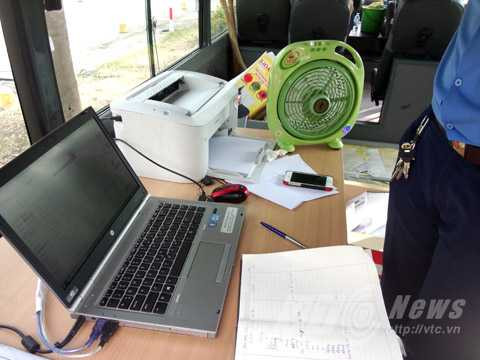 | Máy tính nối trực tiếp đến Bộ GTVT số liệu những xe khi qua trạm cân di động. Ảnh: Huy Phan |