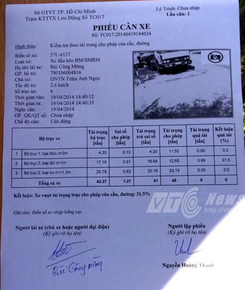 | Phiếu cân xe được in trực tiếp để biết xe quá tải hay không quá tải. Ảnh: Huy Phan |