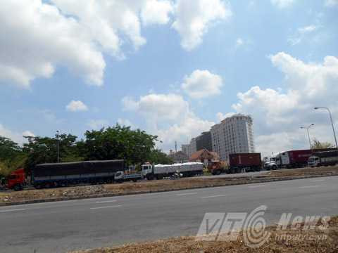 | Xe nằm dài chờ qua trạm cân trên tuyến Nguyễn Văn Linh, Q.7 (hướng từ Phú Mỹ Hưng về miền Tây). Ảnh: Huy Phan |