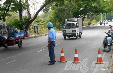 | Thanh tra GTVT điều tiết giao thông làn đường xe dưới 3 tấn và xe máy. Ảnh: Huy Phan |