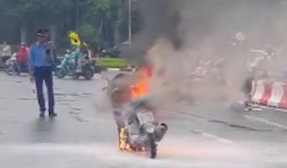 Chiếc xe ga bốc cháy khi đang chạy trên đường.