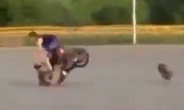 Chiếc xe máy đang bon bon chạy thì đột ngột văng mất bánh trước, kết quả là cả người và xe đều chồm về phía trước, ngã sấp xuống đường.