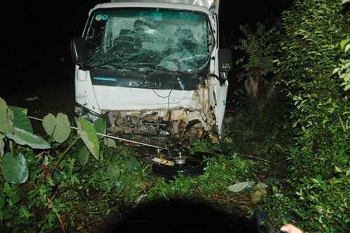 Tại hiện trường, chiếc xe tải bị rơi xuống mương thoát nước phía bên trái đường, vỡ nát phần đầu, kính chắn gió; chiếc xe máy lọt dưới đầu xe tải, vỡ nát, hư hỏng hoàn toàn.