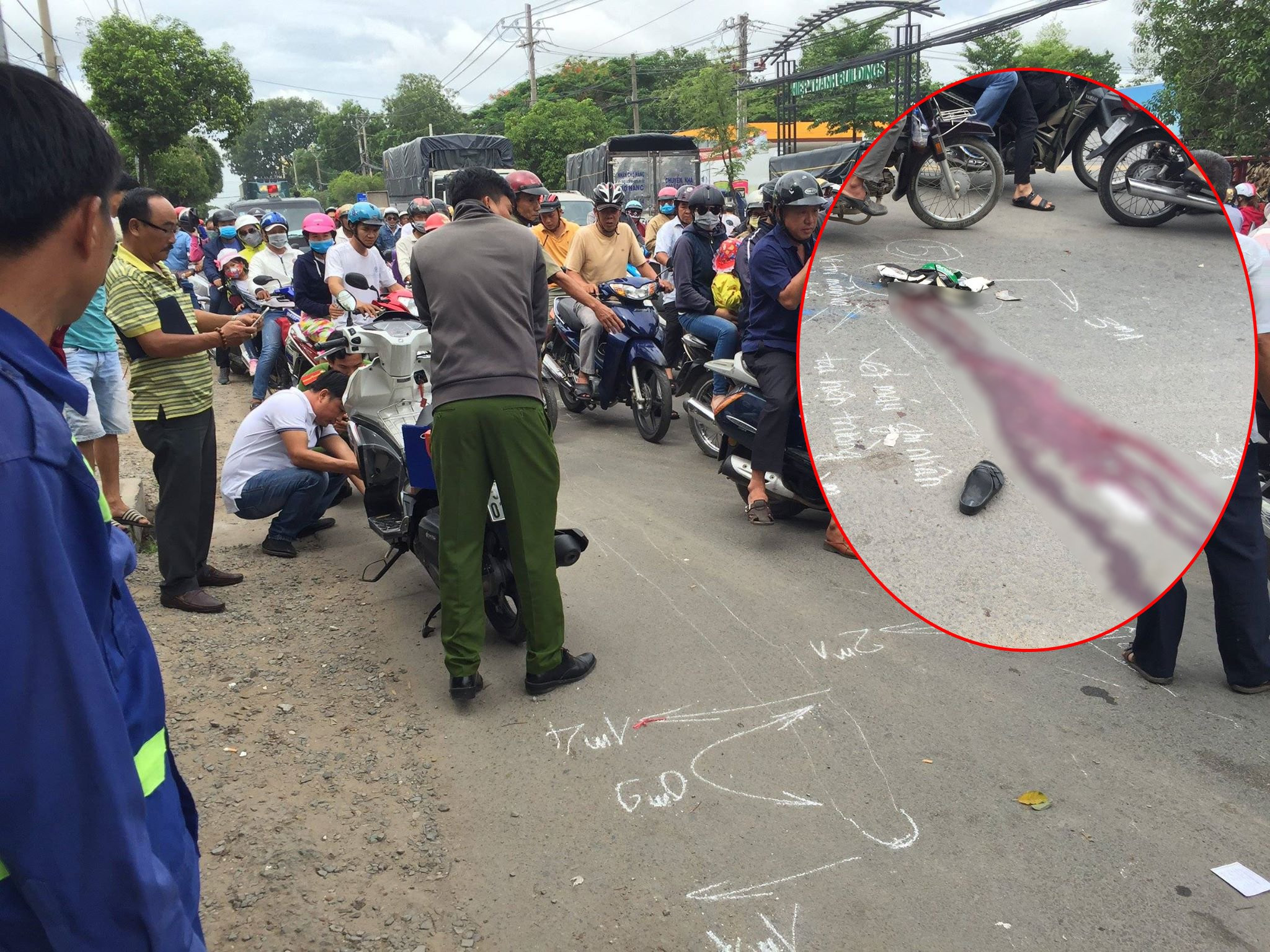 Tại hiện trường, vết máu loang lổ, nhiều mảnh vỡ văng tung tóe, giao thông bị ùn ứ.