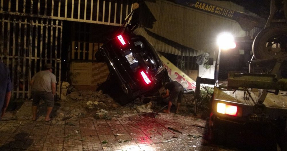 Rạng sáng 16/6, xe Mercedes chạy trên đường Hồ Xuân Hương đến đoạn qua huyện Đồng Xoài thì tông liên tiếp ba căn nhà ven đường.