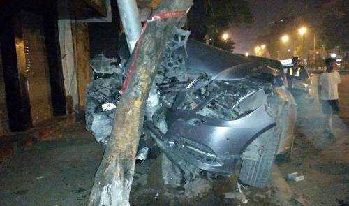 Theo một số nhân chứng, chiếc xe Mercedes 4 chỗ lưu thông trên đường Xuân Thủy hướng về cầu vượt Mai Dịch, bất ngờ lao lên vỉa hè đâm vào cột đèn. Cú đâm mạnh khiến phần đầu chiếc xe nát vụn.