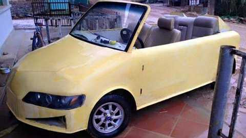 Trong hình ảnh là chiếc xe mui trần tự chế, từ lúc mới chỉ là cái khung đến hoàn thiện. Chiếc xe mui trần tự chế được ra đời từ bộ khung hàn bằng sắt khá thô sơ. Sau đó, xe được lắp thêm những tấm ốp bằng sắt, bổ sung cụm đèn pha và ghế bọc da trước/sau.