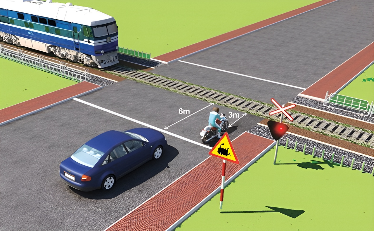 Theo Điều 25 Luật Giao thông đường bộ, khi có phương tiện đường sắt đi tới đoạn giao nhau, người tham gia giao thông đường bộ phải dừng lại phía phần đường của mình và giữ khoảng cách an toàn với rào chắn hoặc không có rào chắn thì phải dừng cách đường ray gần nhất tối thiểu 5m. - B