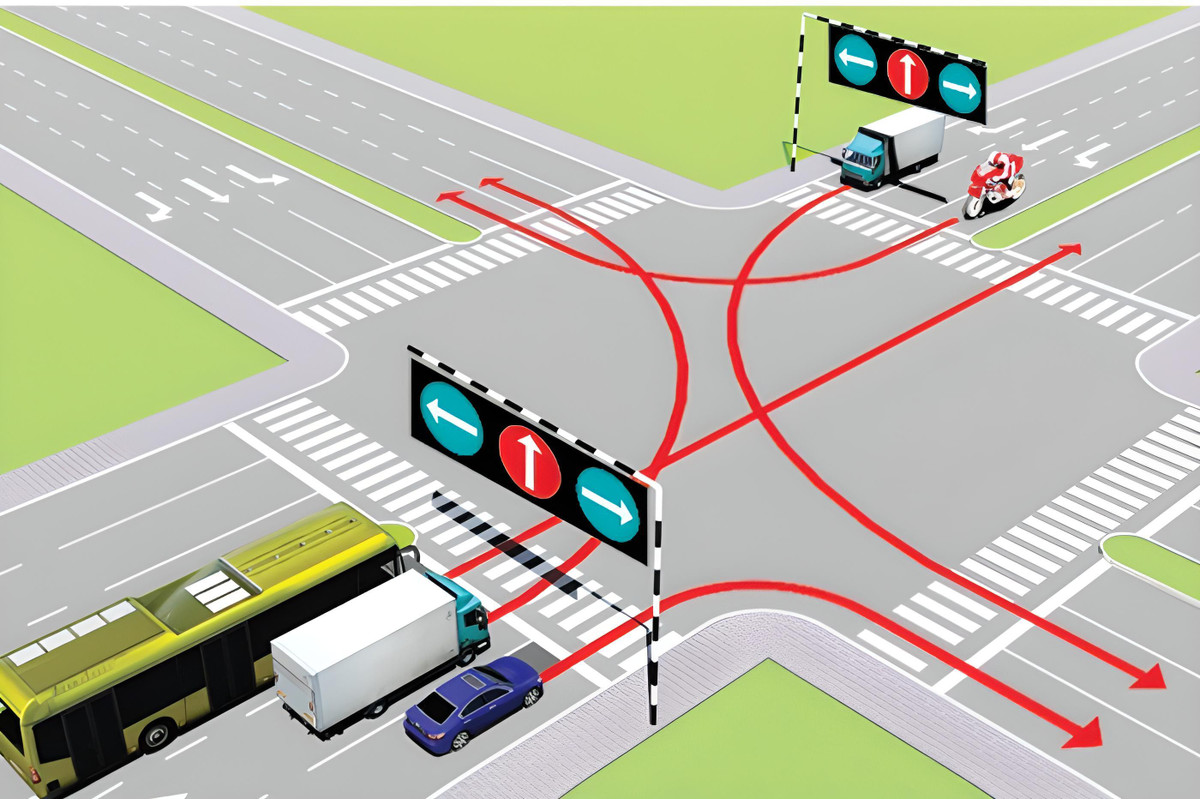Các xe đi theo hướng mũi tên, xe nào vi phạm quy tắc giao thông?