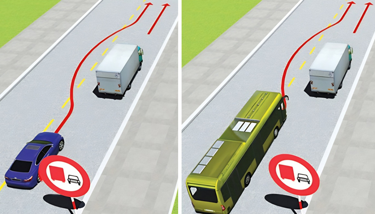 Cả hai trường hợp này xe con và xe khách được phép vượt do không bị cấm.