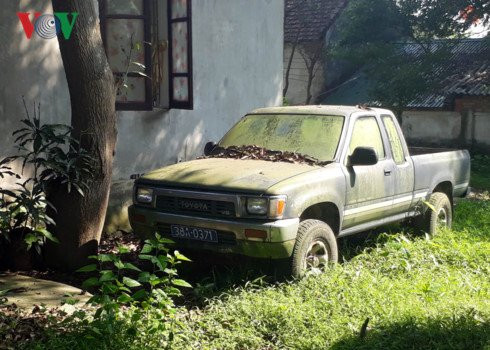 Chiếc xe Toyota bán tải mang biển kiểm soát màu xanh 38A- 0371 vứt ngoài vườn cây, phơi nắng, phơi mưa lâu ngày nên đã bị rong rêu, bụi đất và lá cây bám đầy trên xe.