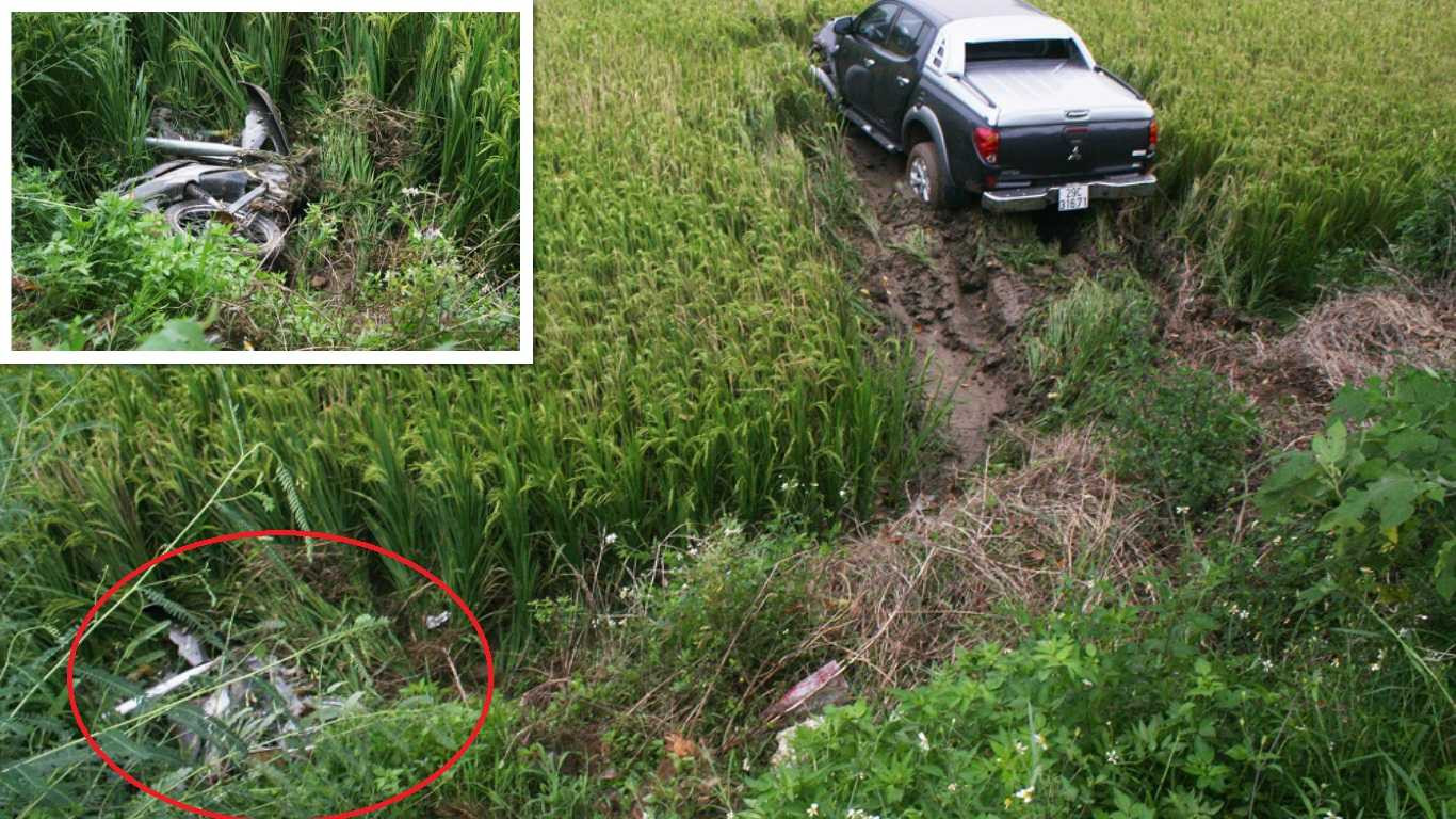 Chiếc xe ô tô nằm gọn dưới ruộng sau cú tông xe máy.