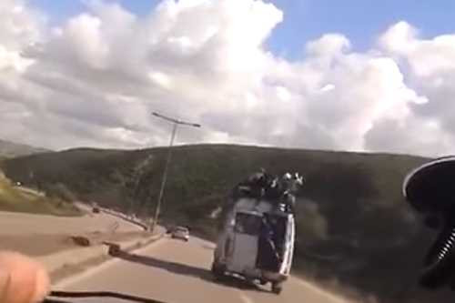 Chiếc xe khách chở quá tải ở Ma Rốc đánh võng trên đường rồi lật sang phải khiến nhiều người ngòi trên nóc xe rơi xuống đường.