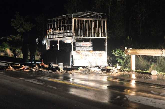 Chiếc xe tải bị bốc cháy dữ dội trong đêm ở Quảng Bình - Ảnh: Zing