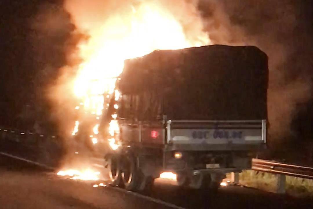 Xe tải bốc cháy trên cao tốc. (Ảnh: N.T)