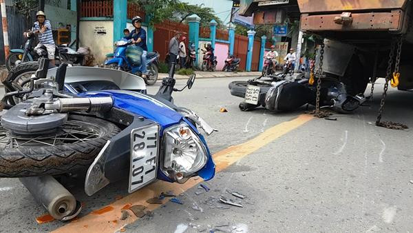 Ghi nhận tại hiện trường, xe máy nằm la liệt, hư hỏng nặng. Trên mặt đường xuất hiện vết cày kéo dài, nhiều bộ phận của xe máy bị vỡ, văng tung tóe. Vụ tai nạn khiến người phụ nữ chạy xe máy BKS 86B6- 164.08 bị thương nặng được đưa đi cấp cứu, những người còn lại bị thương tích nhẹ.