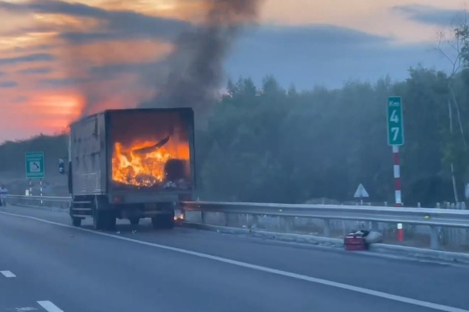 Khi đến km47, thuộc địa phận xã Tân Đức, huyện Hàm Tân (tỉnh Bình Thuận), tài xế điều khiển xe tải phát hiện có khói bốc lên phía sau liền cho xe tấp vào làn dừng khẩn cấp bên đường.