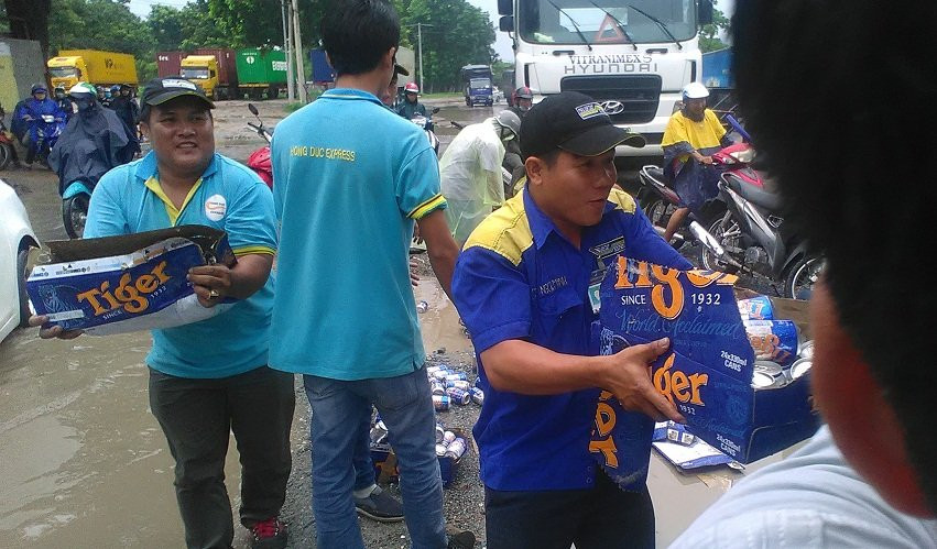 Thấy xe tải chở bia bị lật khiến hàng chục thùng bia rơi xuống đường, công nhân trong một công ty ở Bình Dương đã chạy lại giúp tài xế thu dọn các thùng bia bị đổ tung tóe.