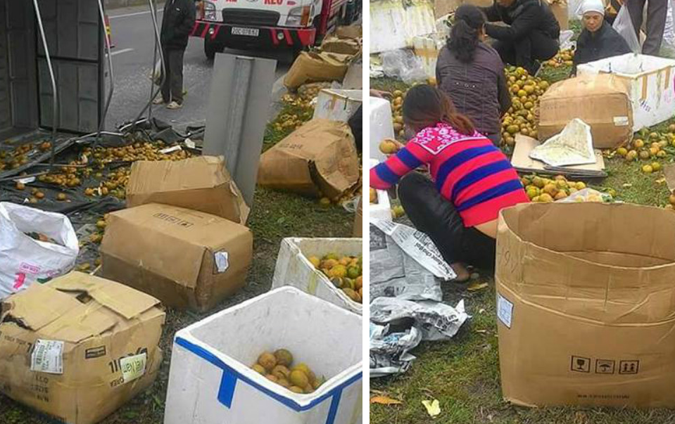 Mới đây, mạng xã hội xuất hiện hình ảnh người dân chung tay giúp tài xế thu gom cam rơi xuống đường khi xe này gặp nạn.