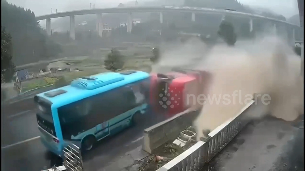 Chiếc xe tải chở cát mất kiểm soát khi đoạn cua khiến phương tiện lật nhào và tông thẳng vào xe buýt tại tỉnh Hồ Nam, Trung Quốc.