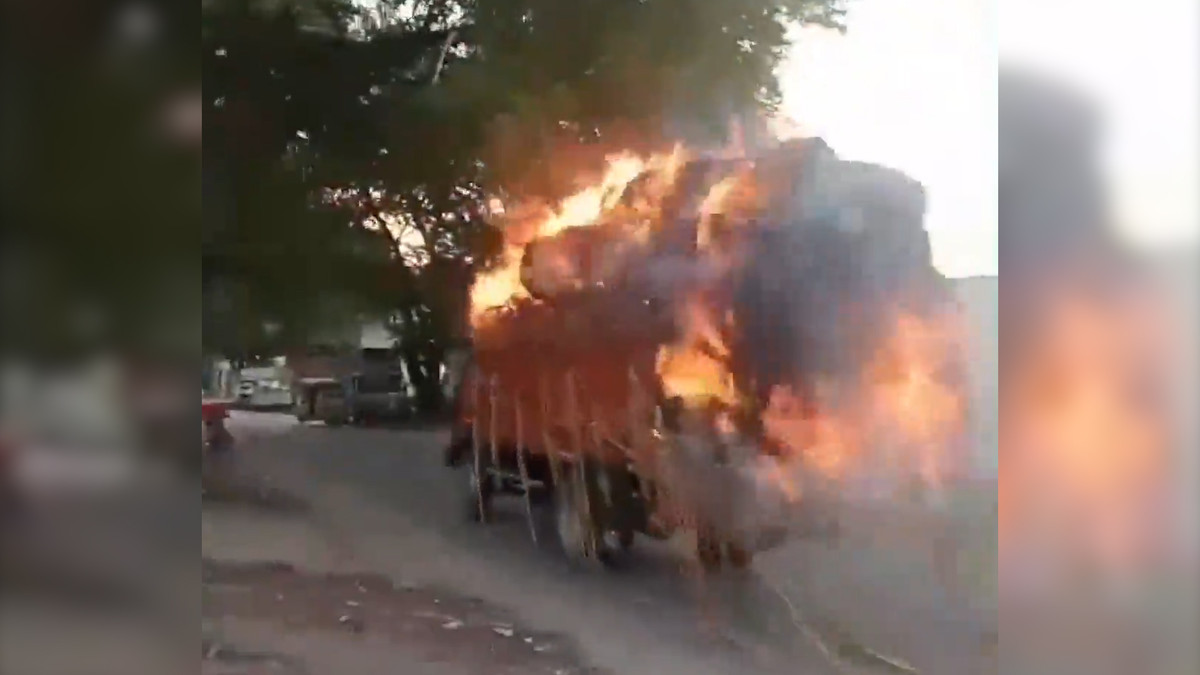 Tài xế cố gắng lái xe ra khỏi khu dân cư sau khi xe tải chở rơm bốc cháy ngùn ngụt trên đường ở Tamil Nadu, Ấn Độ.
