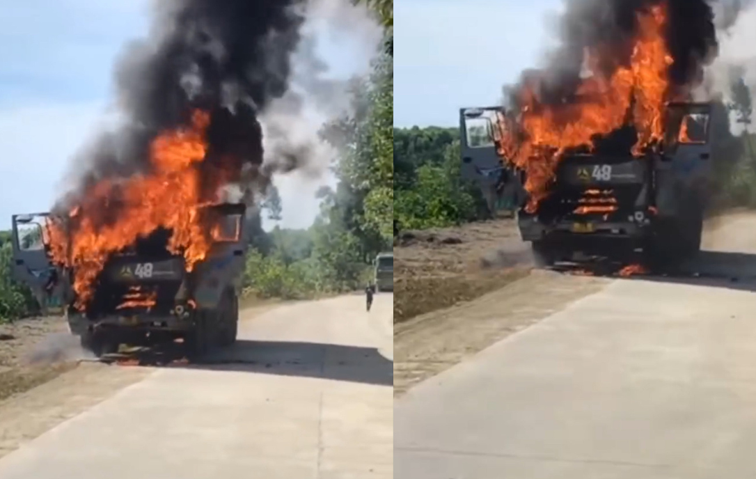 Ngọn lửa nhanh chóng bao trùm lấy cabin rồi toàn bộ chiếc xe. Tài xế may mắn nhảy ra khỏi cabin thoát nạn.