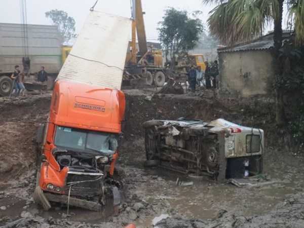 Các nhận chứng kể lại, thời điểm trên, xe khách 4 chỗ ngồi mang BKS 30H chạy hướng Thanh Hóa đi Nghệ An thì bất ngờ bị một chiếc xe cẩu thi công chắn ngang đường.Tình huống bất ngờ khiến tài xế xe khách phải đánh lái sang làn đường ngược chiều. Cùng lúc đó, một chiếc xe du lịch 16 chỗ chạy cùng chiều phía sau lao tới. Cả hai bị xe container chạy ngược chiều tông trực diện, hất xuống hố công trình.