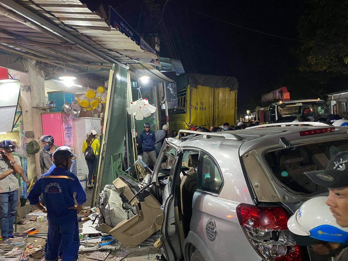 Tại hiện trường, xe tải và xe ô tô 7 chỗ bị biến dạng phần đầu. Phần mái hiên và cửa của căn nhà kinh doanh tạp hóa bị đổ sập.
