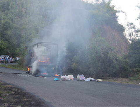 | Hiện trường chiếc xe tải đang cháy lớn |