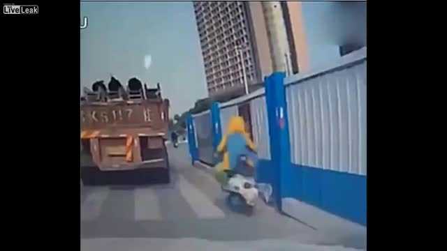 Người đi chiếc scooter xấu số cố gắng len vào khoảng trống giữa xe tải và tấm dựng chắn công trình ở Trung Quốc. Bất ngờ xảy đến khi tài xế xe tải bắt đầu hơi đánh lái sang phải, khối thép dài trên thùng theo quán tính rơi nghiêng vì không chằng buộc, trúng người đi xe máy.
