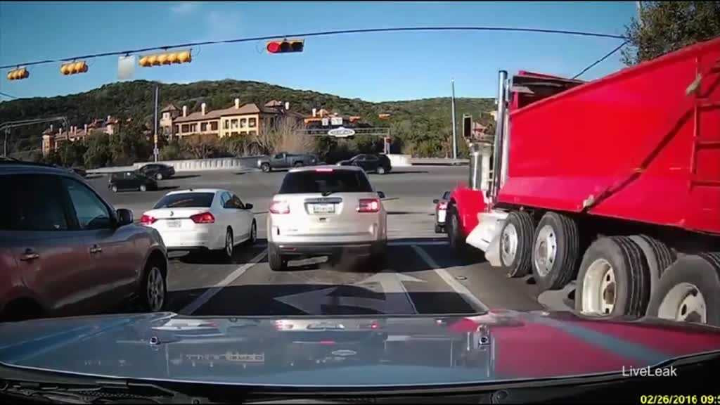 Xe tải màu đỏ lao đi với tốc độ kinh hoàng, đâm nát chiếc ôtô con đang dừng chờ đèn đỏ phía trước, vụ tai nạn kinh hoàng xảy ra tại một ngã tư đông đúc ở thành phố Austin, bang Texas, Mỹ.