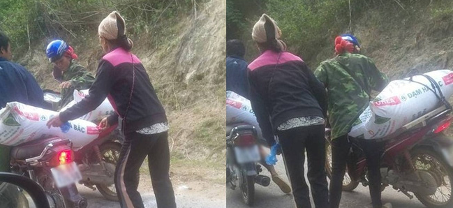 Hình ảnh dân mang bao đạm lên xe máy chở đi. Ảnh N.H.