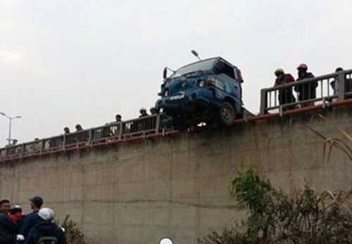 | Xe tải treo lơ lửng trên thành cầu Thanh Trì |