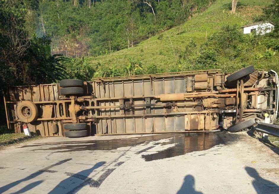 Đến địa phận xã Phước Mỹ, huyện Phước Sơn, tỉnh Quảng Nam, xe tải bất ngờ tự lật, nằm chắn ngang mặt đường.