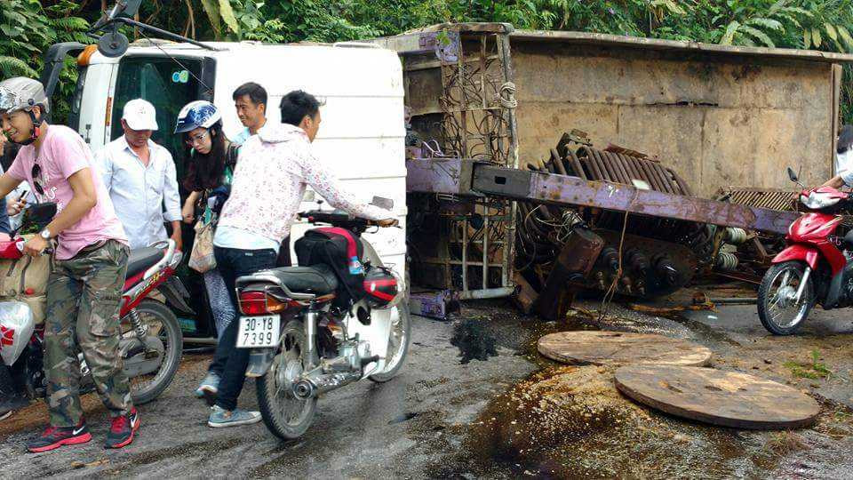 Tại hiện trường, chiếc xe tải bị lật nghiêng, hàng hóa trên thùng xe rơi ra đường. Vụ việc khiến giao thông trên quốc lộ 2B bị ùn tắc kéo dài.