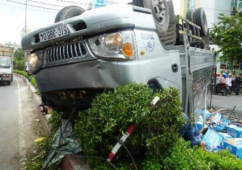 Chiếc xe tải lật nhào giữa phố Sài Gòn vào trưa 5/6.
