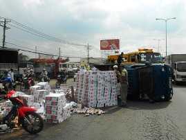 (VTC News) - Lúc 14h30 ngày 6/5 gần cầu Bến Cát - QL 1A (thuộc P.Thới An, Q.12, TPHCM) một xe tải trọng tải 1,25 tấn đã bị lật nhào, hàng trăm két bia văng xuống đường gây ùn tắc giao thông cục bộ.