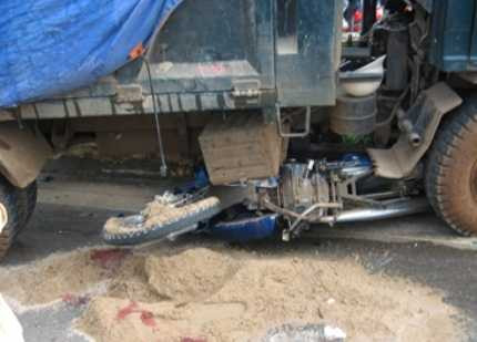 Đến khu vực đường cắt Lê Lợi - Nguyễn Tất Thành, xe máy bất ngờ bị xe tải chở cát của cửa hàng vật liệu xây dựng Hồng Chi, biển số 81C-01423 do một người đàn ông điều khiển theo hướng Phạm Văn Đồng - Nguyễn Tất Thành tông phải.