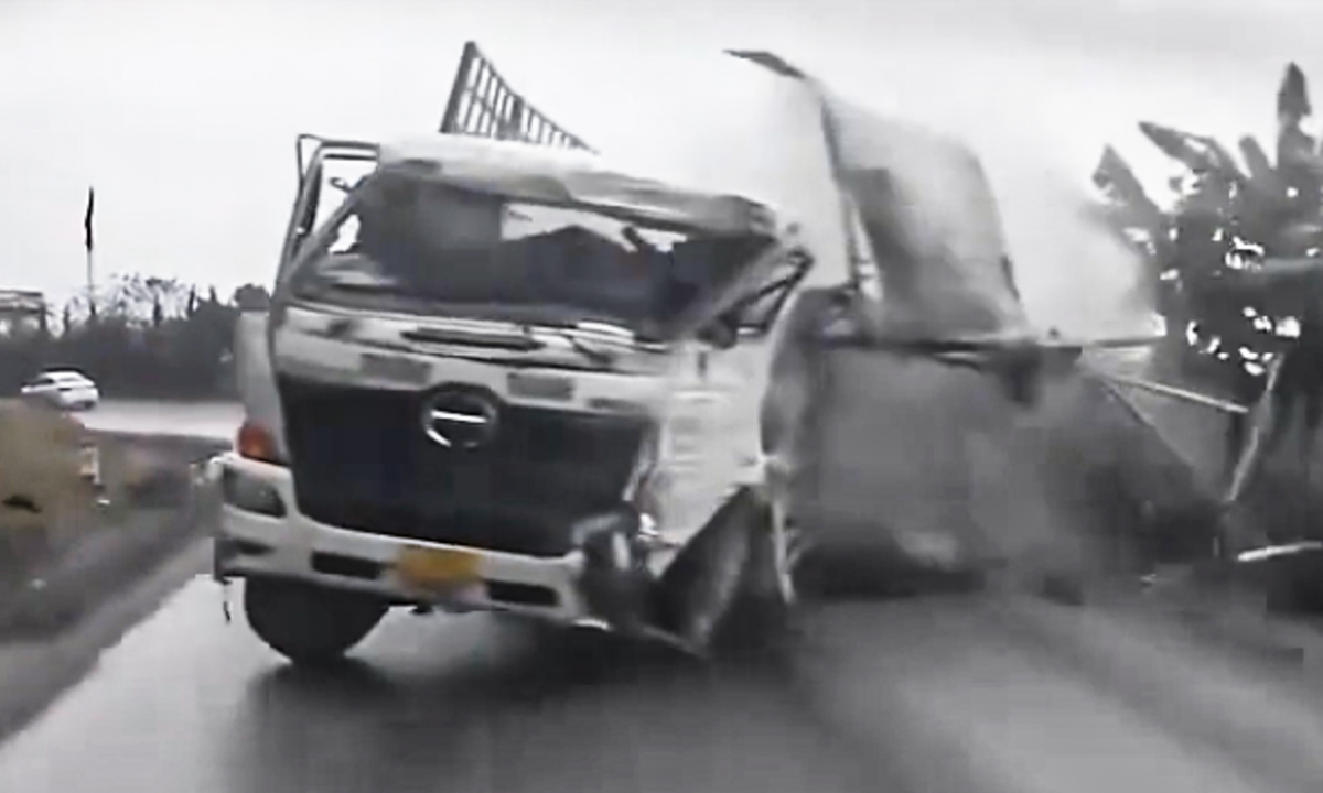 Sau cú va chạm, xe tải vẫn không thể dừng lại mà tiếp tục lao về phía trước trên đoạn đèo dốc.