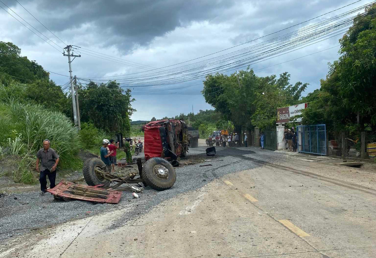 Tại hiện trường, xe lật nghiêng, đá đổ ra đường, bánh xe rơi ra ngoài cách chiếc xe 50m.