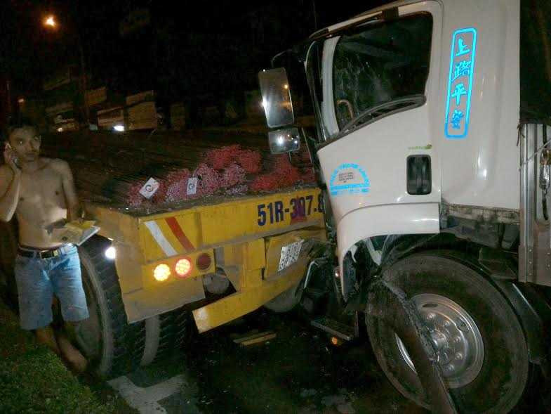 Khi đến địa bàn ấp Me, xe tải thì bất ngờ tông mạnh vào phần sau xe đầu kéo BKS 51C-907.59 kéo theo rơ móc BKS 51R-307.85 do tài xế Vũ Ngọc Tuấn (SN 1983, ngụ xã Hòa Trung, huyện Di Linh, tỉnh Lâm Đồng) điều khiển chở sắt đang bị hư và dừng xe trên làn đường dành cho xe ô tô.