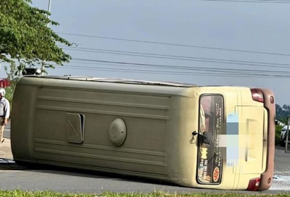 Ô tô khách lật nghiêng sau tai nạn, 18 hành khách bị thương.