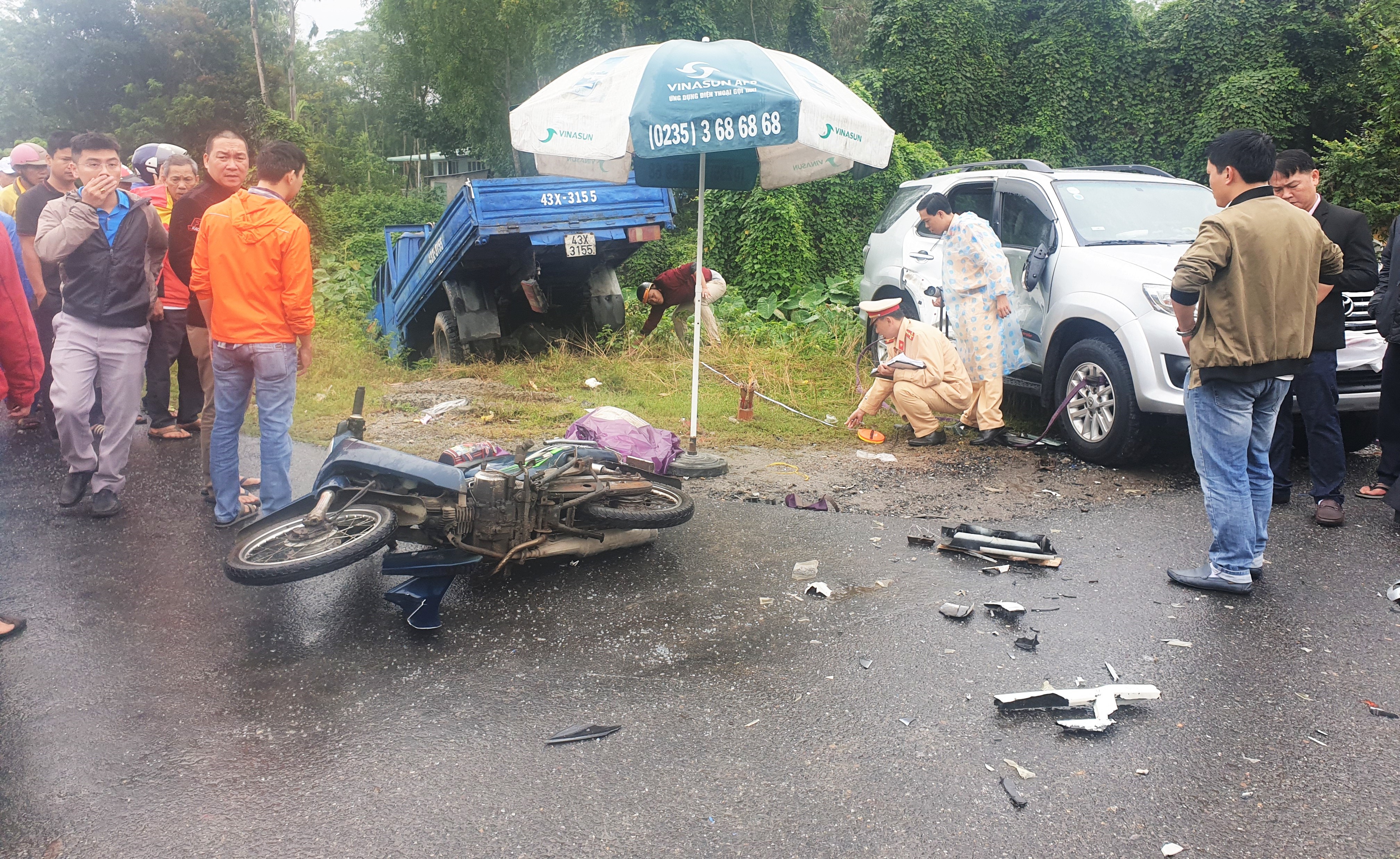 Vụ tai nạn khiến ô tô và xe máy hư hỏng nặng, còn chiếc xe tải lao sang bên đường, lọt dưới hố sâu gần 4m so với mặt đường.