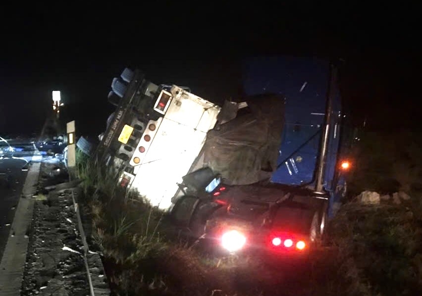 Sau va chạm, xe đầu kéo bị húc xuống lề đường, còn xe tải bị lật ngang đè trúng người tài xế xe đầu kéo, khiến tài xế tử vong tại chỗ.