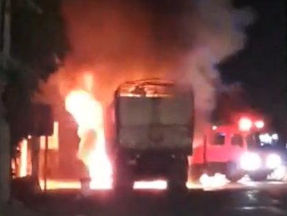 Chiếc xe tải bắt đầu bốc cháy từ cabin sau đó lan xuống phía sau. Hai người ngồi trong xe nhanh chóng nhảy ra ngoài thoát thân.