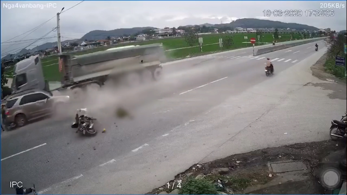 Xe tải không giảm tốc khi tới ngã tư, đâm vào chiếc SUV, đẩy đi một đoạn rồi đâm tiếp hai xe máy trên quốc lộ 1A (đoạn qua tỉnh Nghệ An).