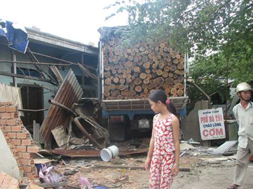 Xe tải chở đầy gỗ này chỉ chịu dừng lại sau khi tông sập gần như toàn bộ các mái che phía trước và nhiều vách tường của 3 tiệm phở.